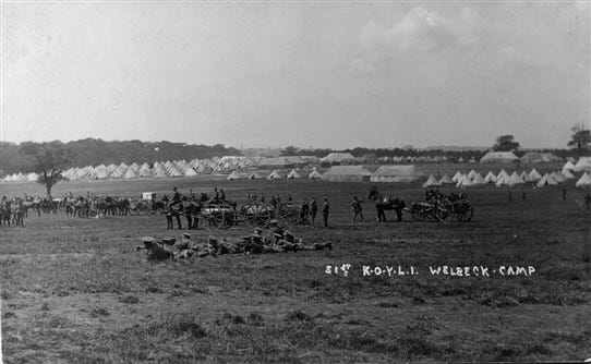 This reception still ringing in his ears, he was then off to war. First, he went to Welbeck Camp in Nottinghamshire, where he was quickly introduced to the reality of wartime conditions. The training camp had been set up soon after the outbreak on the requisitioned land of Welbeck Abbey to the south of Worksop. By Autumn 1918, the camp was submerged in flood water and the mud inescapable. Holst wrote his correspondence from the YMCA cookhouse, which he described as ‘the driest part of camp’ in that ‘only 3/4 of the ground is flooded so far.’